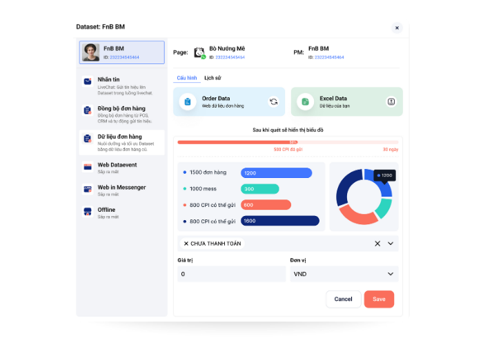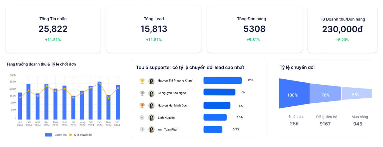 Báo cáo hiệu quả tăng trưởng tin nhắn, lead và đơn hàng qua các kênh như Messenger, Ads, bình luận, giúp theo dõi hành vi, phân tích khách hàng và tối ưu chuyển đổi.