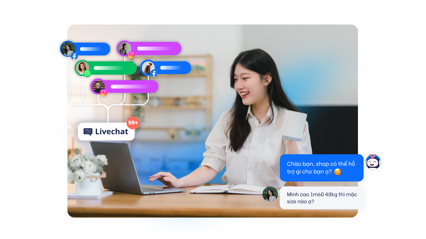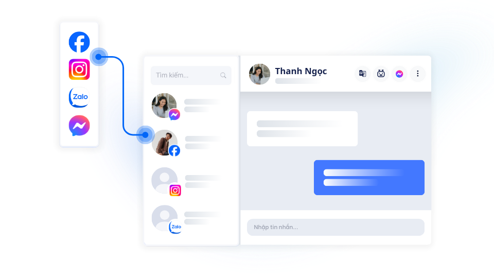 Tương tác cùng lúc với hàng trăm khách hàng từ nhiều tài khoản kênh như: Facebook, Messenger, Instagram, Whatsapp, Website, Zalo cá nhân, Line,...