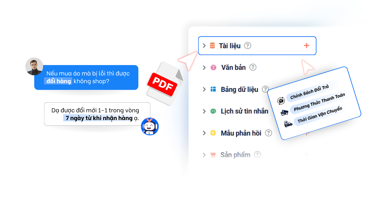 Việc đào tạo AI để trả lời khách hàng đã được Smax AI đơn giản hoá vô cùng dễ dùng. Người dùng chỉ việc tải lên tài liệu doanh nghiệp, sản phẩm và nhập mong muốn về cách AI sẽ trả lời khách, vai trò của AI, các hạn chế,... với sự hỗ trợ của tính năng tối ưu prompt của Smax!