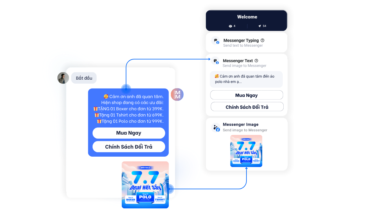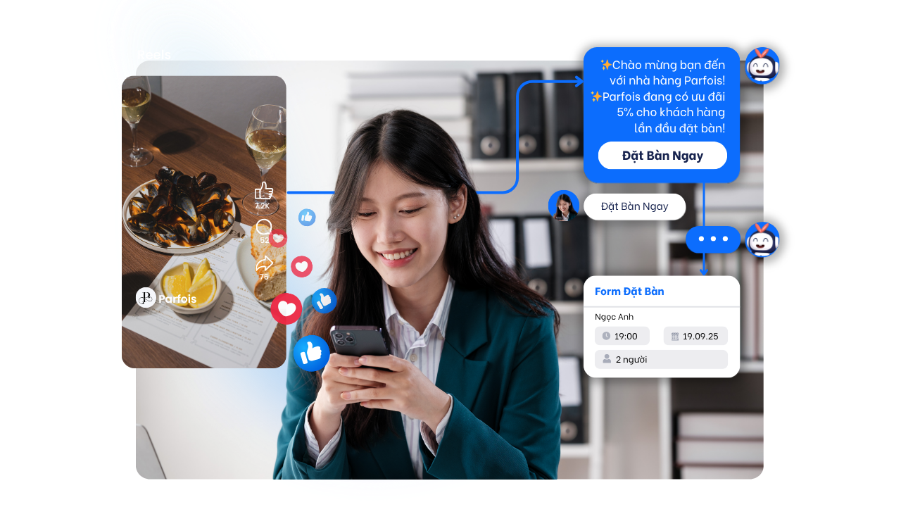 Tích hợp với các module game, trang bán hàng, form để giúp thu thập thông tin và bán hàng cho khách ngay trong luồng nhắn tin