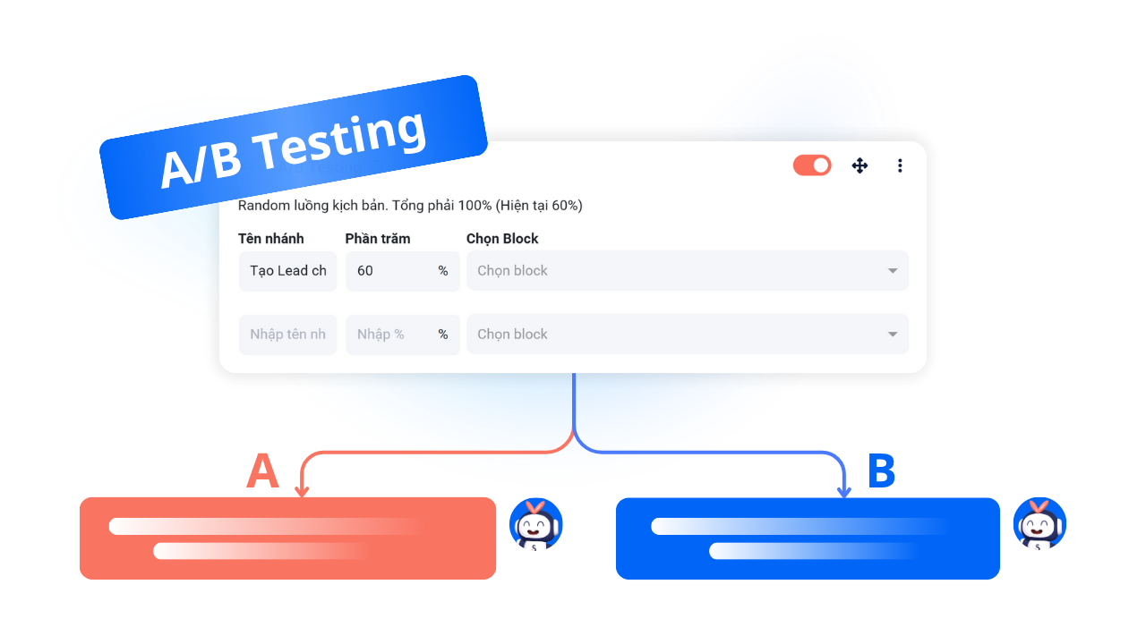 Chatbot hỗ trợ A/B testing luồng bot nào hiệu quả nhất, phân luồng bot tệp khách hàng theo điều kiện nhất định hoặc trích xuất nhu cầu, vấn đề từ lời phản hồi của khách thành thông tin và nhiều hơn nữa giúp tạo bot như ý.