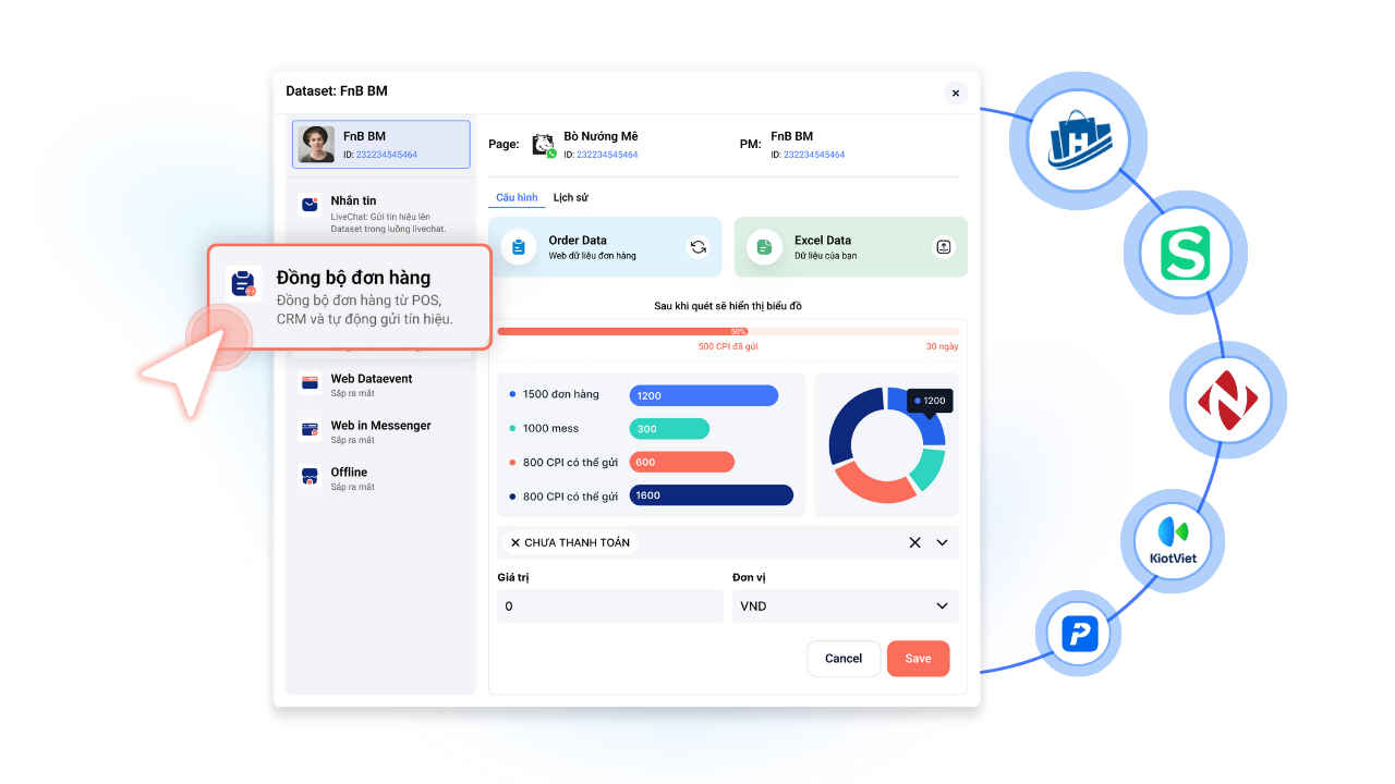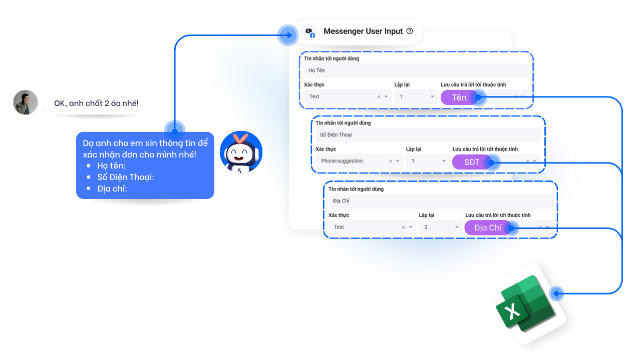 Chatbot tích hợp với Google Sheet, các phần mềm quản lý bán hàng phổ biến, hoặc API để lên đơn và truyền dữ liệu khách hàng 2 chiều