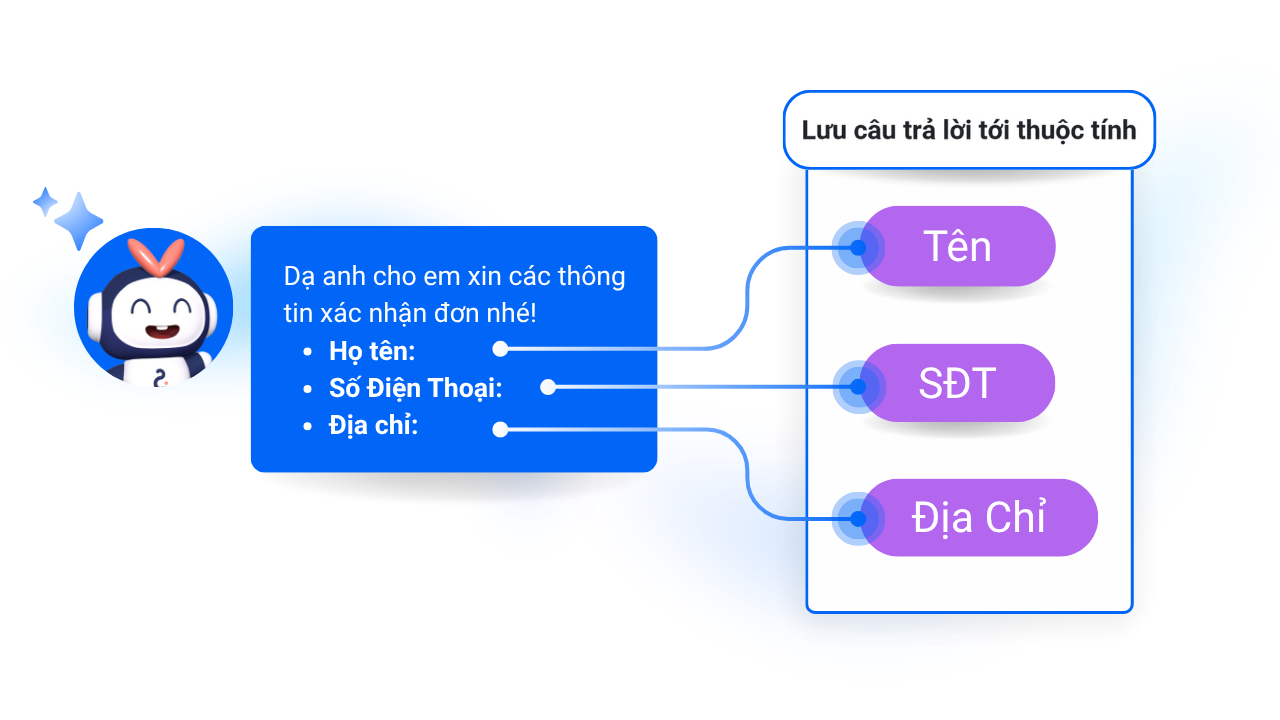 Bot đặt ra các câu hỏi ngắn để thu thập các thông tin cá nhân để tạo đơn hoặc thông qua việc lựa chọn các nút chọn lựa